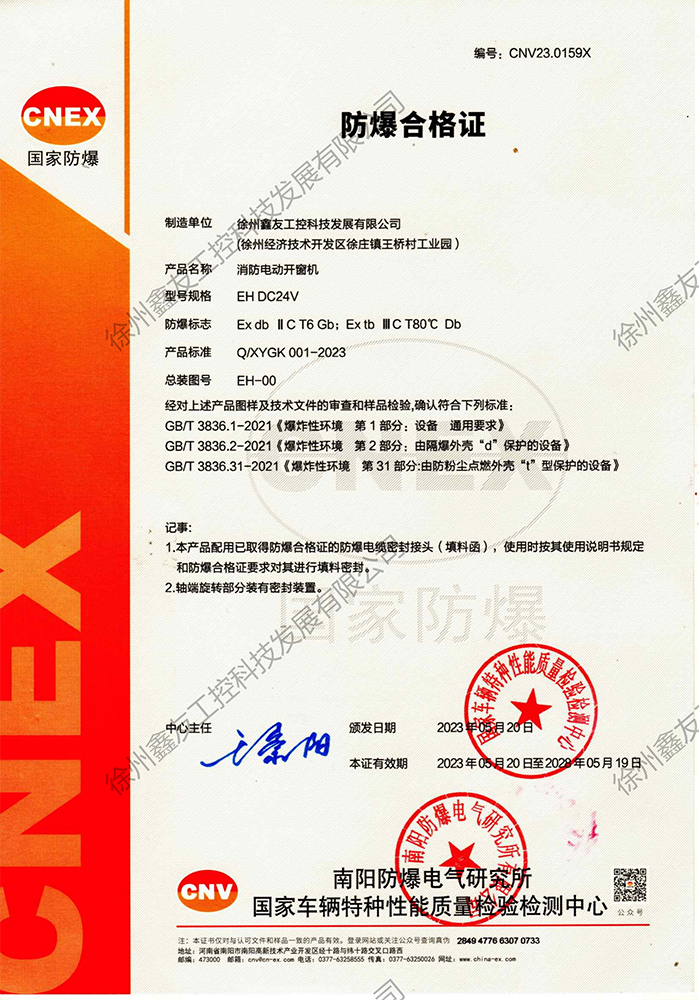 徐州鑫友工控科技發(fā)展有限公司成立于2008年,占地31600平方米,全資子公司:江蘇良紫工程科技有限公司,旗下 有“鑫友”及“MASTER.W主人窗控”兩個品牌系列,公司全面貫徹執(zhí)行IS09001:2015質(zhì)量管理體系標準,產(chǎn)品順利通過歐盟CE認證和中國***消防電子產(chǎn)品認證,通過可燃性粉塵環(huán)境下、爆炸性環(huán)境下防爆合格產(chǎn)品檢驗。排煙天窗整窗通過***消防產(chǎn)品質(zhì)量監(jiān)督檢驗中心檢測。先后獲得多項******及榮譽證書。集研發(fā)、加工、生產(chǎn)、制造、銷售、安裝及售后于一體,是一家高起點、研發(fā)能力強的專業(yè)智能化***技術(shù)企業(yè)。